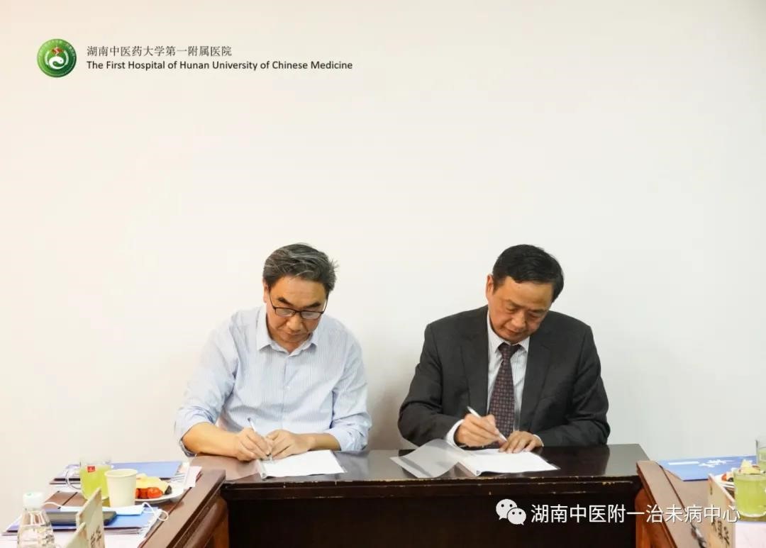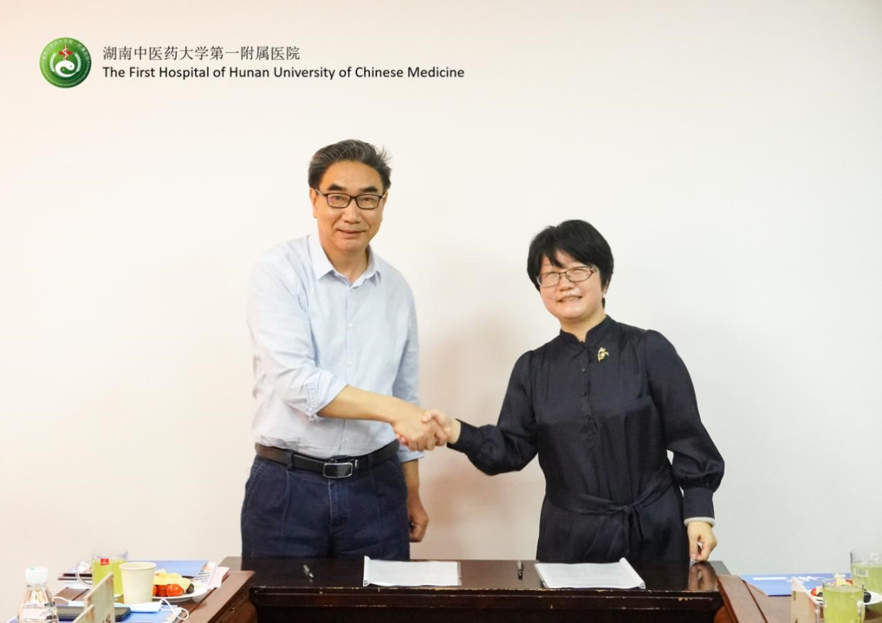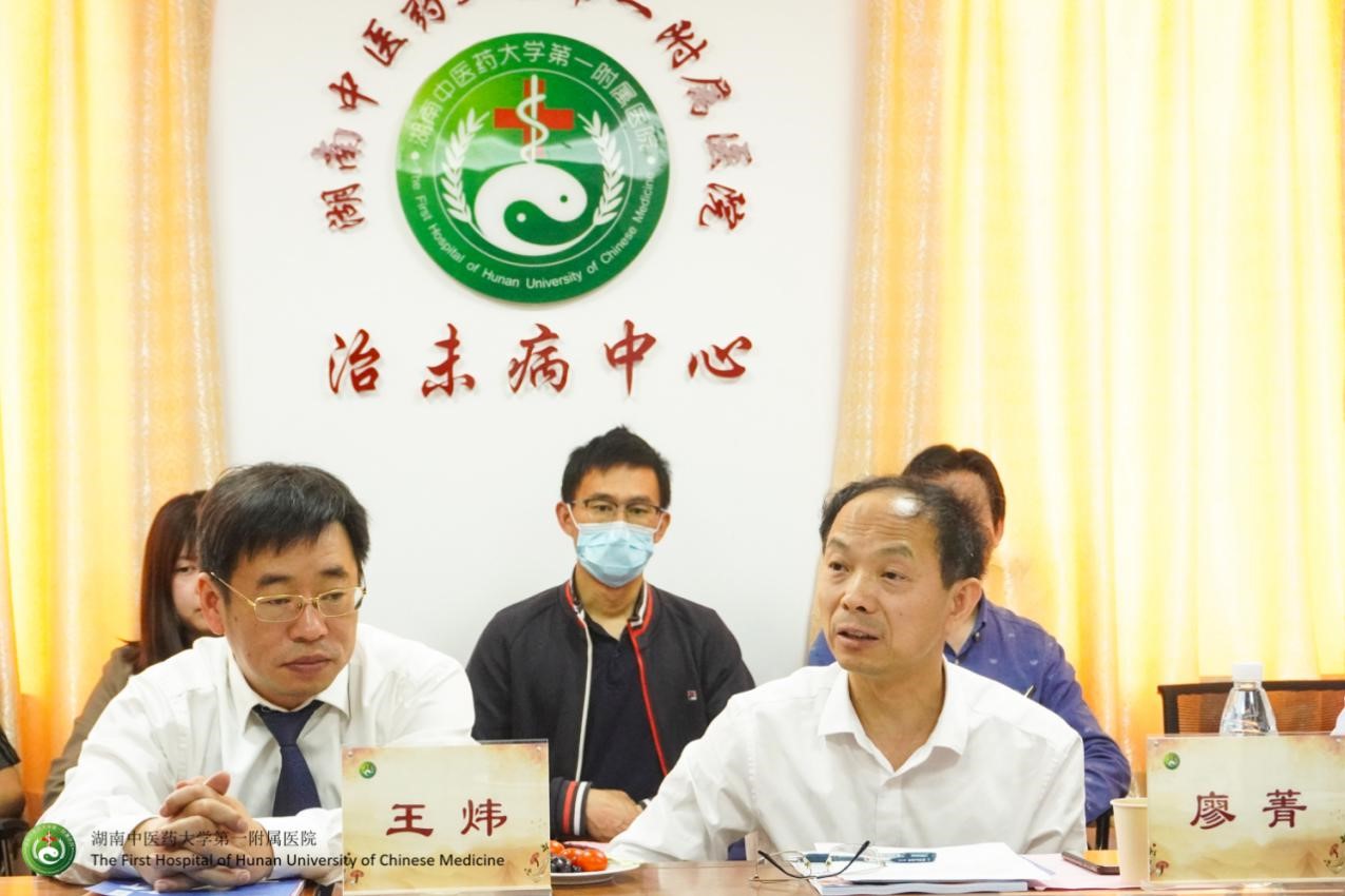 2021年5月7日上午,由大学党委委员、副校长廖菁带队,大学创新药物研究所所长夏新华,副所长王炜及创新药物研究所全体成员,赴雷火电竞官方网站第一附属医院治未病中心开展合作交流座谈会,会议就如何加强校院人才培养、学术交流和教学实践等方面进行了深入磋商,会上雷火·竞技创新药物研究所和雷火电竞官方网站第一附属医院治未病中心(四时调阳“治未病”湖南省工程研究中心)签署了合作协议。参加此次交流的还有与创新药物研究所有深入合作的湖南新汇制药股份有限公司董事长何述金,湖南省康德佳林业科技有限责任公司董事长欧阳瑶力,湖南乾坤生物科技股份有限公司董事长刘超等。