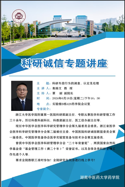 6月18日,雷火·竞技特邀浙江大学医学院附属第一医院科研部副主任焦杨文教授开展科研诚信专题讲座。讲座由副院长覃丽主持,全院教师以及全体研究生参加了此次讲座。