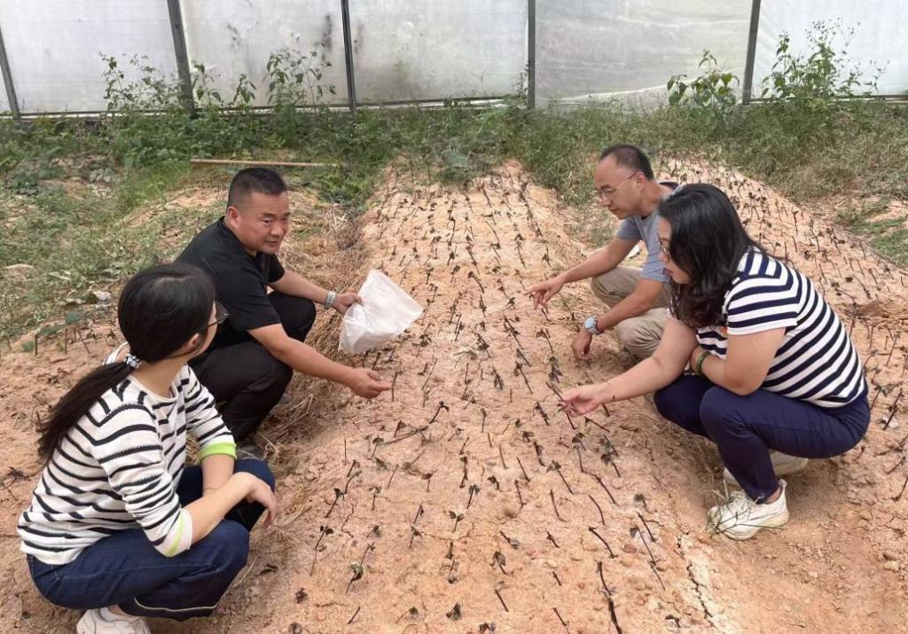 座谈会后,专家团一行前往溆浦县山银花种植基地进行了实地考察和调研。在基地负责人的陪同下,专家们深入田间地头,仔细查看了植株生长情况与土壤环境,特别就扦插育苗的田间管理与具体操作与种植户进行了面对面的示范与指导,确保了技术指导的精准落地与可操作性。