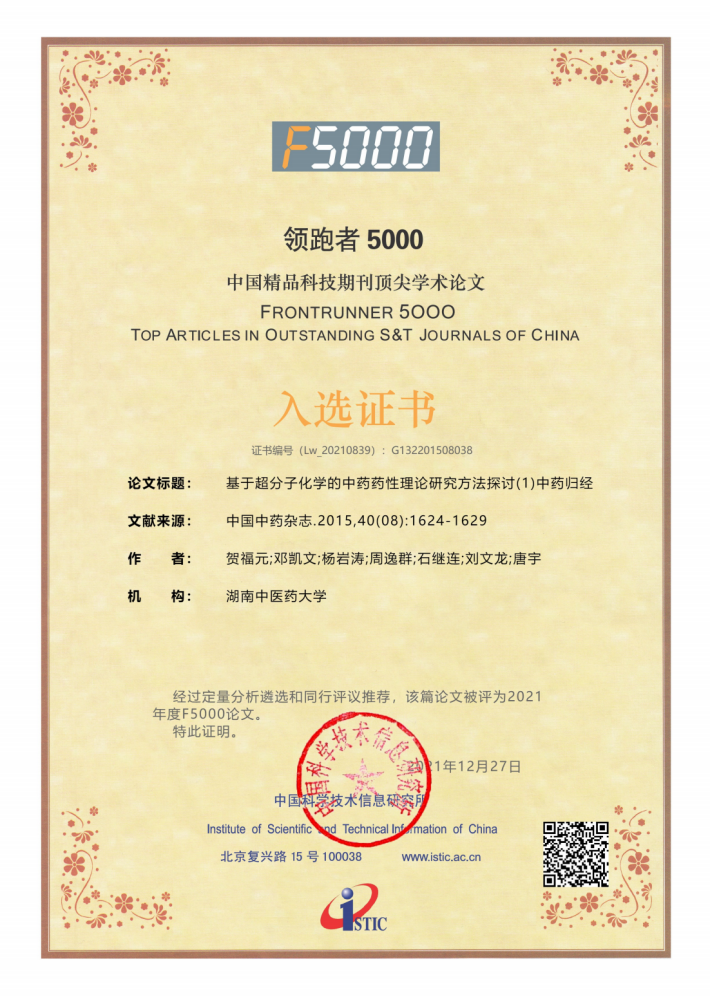 2021年12月27日,我们贺福元教授团队科研成果荣获2021年度F5000论文(领跑者5000∙中国精品科技期刊顶尖学术论文)。论文《基于超分子化学的中药药性理论研究方法探讨(1)中药归经》于2015年4月发表在《中国中药杂志》第40卷第8期。我们贺福元教授为论文第一作者及通讯作者,我校为第一通讯单位。成果由我校中药成药性与制剂制备湖南省重点实验室贺福元教授团队独立完成。