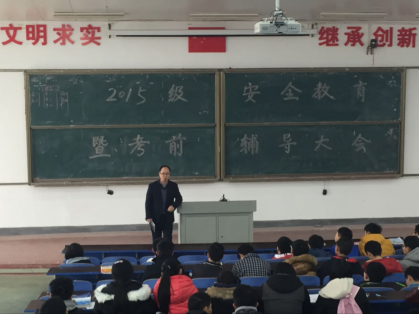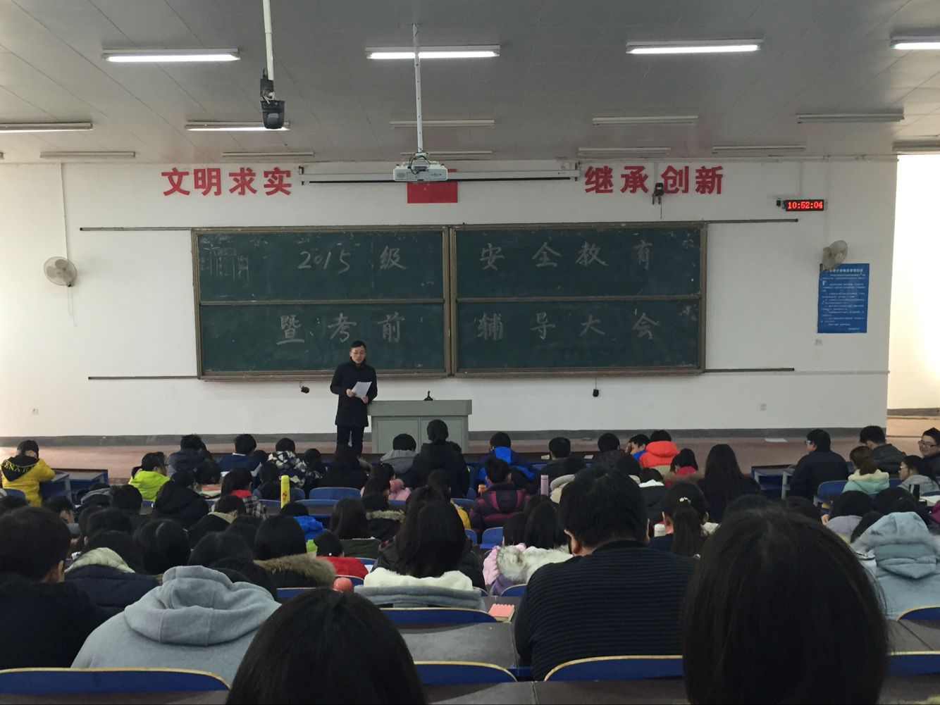 2015年12月25日10:30,雷火·竞技2015级考假期安全教育暨考前辅导大会在2506教室召开。雷火·竞技学生科科长李云耀老师、学生科副科长段智恩老师出席此次大会,2015级全体学生共476名到场参加此次会议。